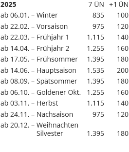 Saisonzeiten und Preise bei Belegung mit 2 Gästen